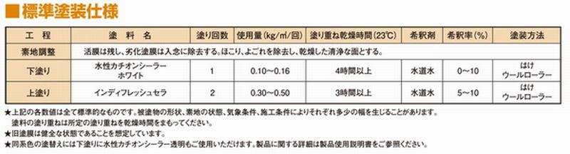 | 容量: 20kg 1缶あたり塗装可能面積 既存塗膜が、ジュラク風・砂壁風・ウェーブの場合 : 25〜33u(2回塗り) 既存塗膜が、ラフ・模様ローラーヘッド押え・吹付スタッコヘッド押えの場合 : 22〜28u(2回塗り) 既存塗膜が、くし目ローラープレス・ローラーレリーフ・ラージコームラインの場合 : 20〜25u(2回塗り) |